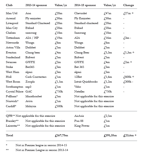 The overall figure was also reduced as relegated clubs Fulham, Norwich and Cardiff earned a combined total of £6.5m from their shirt sponsorships last season, while promoted sides QPR, Burnley and Leicester City pull in a lower combined total of £4.5m, a drop of £2m.