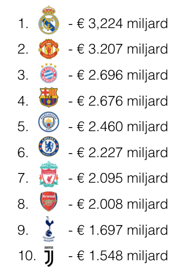 Top 10 Europese clubs op ‘ondernemingswaarde